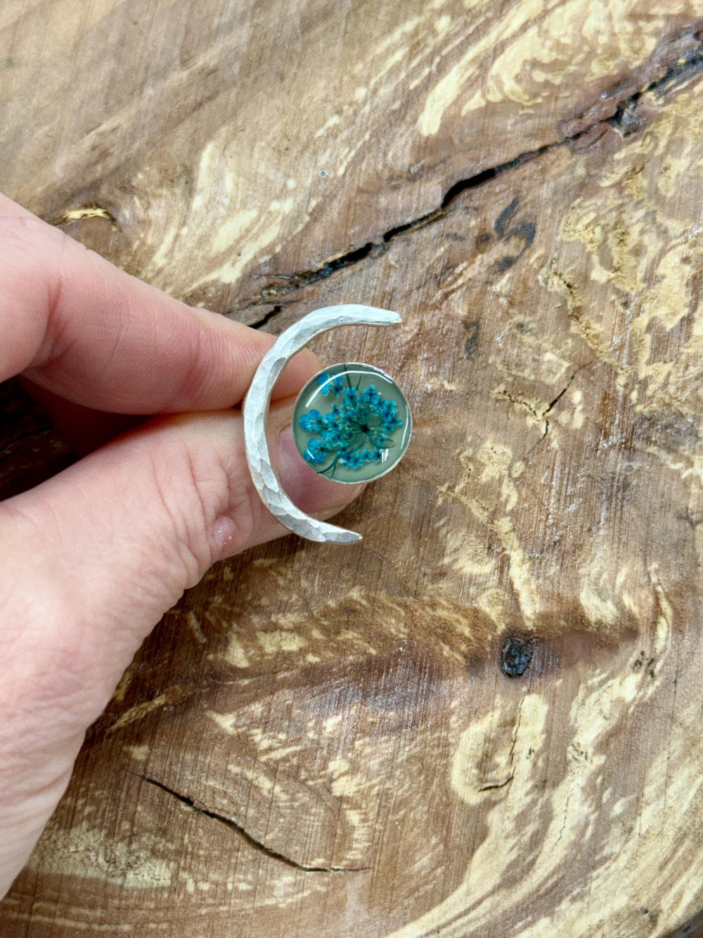 70s inspired Dried Flower Ring - boho - hippie - Statement Ring - Crescent Moon Celestial