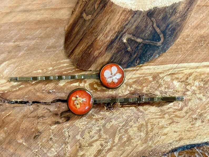 Bring a touch of the outdoors into your everyday style with these handcrafted botanical bobby pins. Each piece features real dried flowers carefully preserved in resin against a warm, earthy orange backdrop. The natural elements are highlighted by antique bronze-toned settings, creating a timeless, organic accessory.