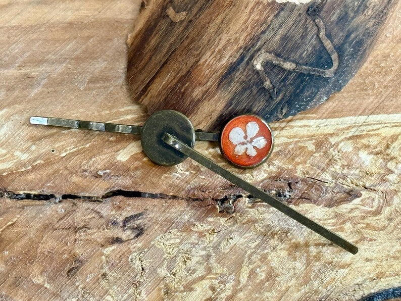 Bring a touch of the outdoors into your everyday style with these handcrafted botanical bobby pins. Each piece features real dried flowers carefully preserved in resin against a warm, earthy orange backdrop. The natural elements are highlighted by antique bronze-toned settings, creating a timeless,...