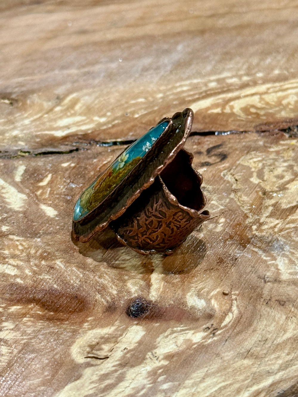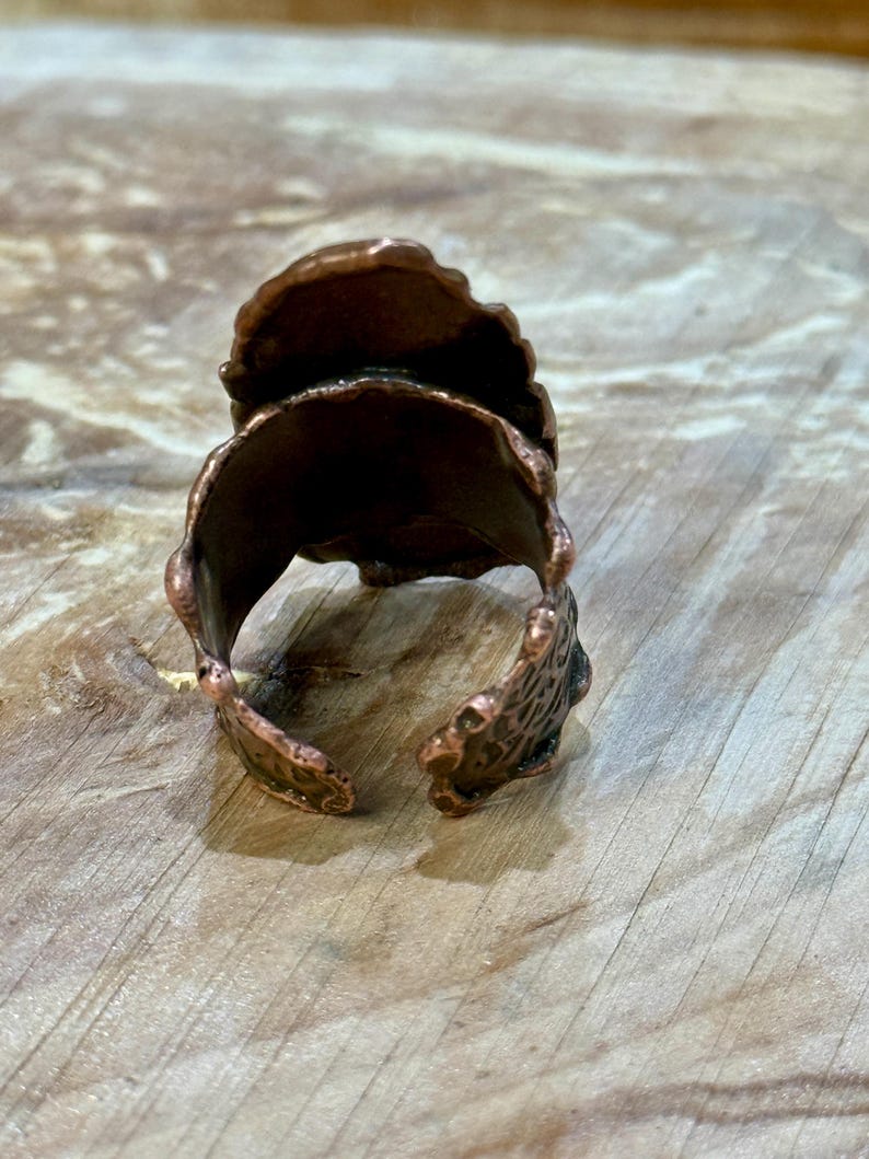 Step into the free-spirited energy of the 70’s with this one-of-a-kind statement ring. Handcrafted with a hammered brass base and finished with a warm copper plating, this piece carries both earthy charm and vintage soul.
